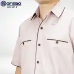 Kemeja kerja simpel dari bahan american drill dengan warna mayor krem muda dan list coklat memberikan tampilan simpel dinamis dan elegan.