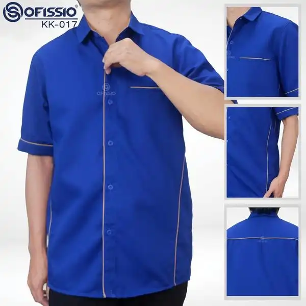 Kemeja kerja simpel dari bahan american drill dengan warna mayor biru benhur dan list krem memberikan tampilan simpel dinamis dan elegan.